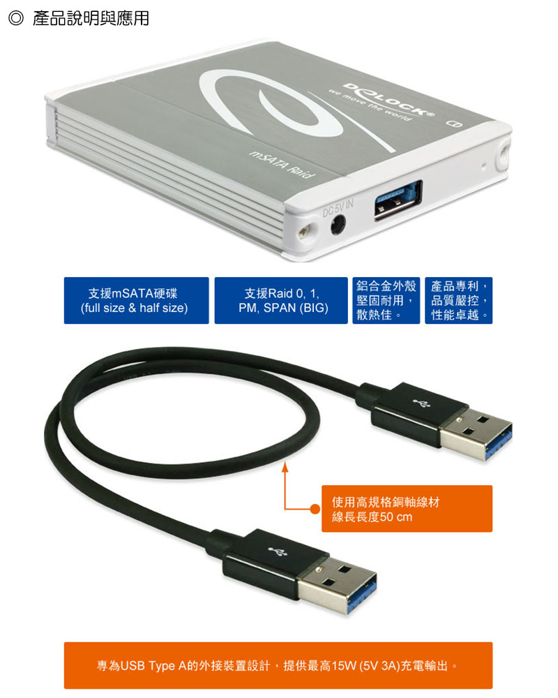 附件中所提供的 " USB 3.1 Gen 2 Type A to Type A公頭連接埠線材x1 "  此線材專為USB Type A female Device 設計的專業高規格銅軸線材。廣泛應用於相關產品含有USB Type A female 裝置中。是您必備的"電源資料傳輸線"之一。Delock 所生產的硬碟外接盒皆適用。