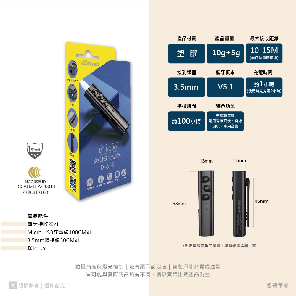 商品規格: ◆介面:Bluetooth V5.1 ◆藍牙名稱:BTR100 ◆最大接收距離:10-15M(無任何障礙環境) ◆支援模式:支援模式 ◆電池型式:聚合物鋰電池70mAh(電流保護/過充/不過流/輸出短路保護) ◆電壓:5V ◆工作電壓/電流:3.3V-.2V/≤15mA ◆LED顯示:紅藍燈 ◆靈敏度:-90.5dbm ◆充電時間:約一小時(使用前請先充電2小時) ◆待機時間:約100小時 ◆工作溫度:-40—85℃ ◆播放音樂時間:約4~5小時(視設備與音量而定) ◆讀卡機:TF卡(Micro SD卡),支援到32GB ◆產品尺寸:14x59x15mm ◆產品重量:10g±5g ◆材質:塑 膠 ◆包裝尺寸:68x26.5x137mm ◆包裝內容:藍芽接收器x1,Micro USB充電線100CMx1,3.5mm轉接線30CMx1,保固卡x1 ◆NCC認證:CCAH21LP2100T3 ID型號:BTR100 ◆一年保固 注意事項: 1.該產品非玩具,請置於孩童不易取得之處,以免發生危險。 2.請勿置於腐蝕或高溫環境中。 3.請勿過度拉扯,避免線材斷裂損毀。 4.購買前請先確認接頭是否適用您的電子設備。 本產品一年保固:新品七天換貨 / 保修一年 商品如有非人為損壞或瑕疵,新品請於購買七日內洽原購買地, 並持發票(或購買證明)與產品(包裝及配件需完整保留)。