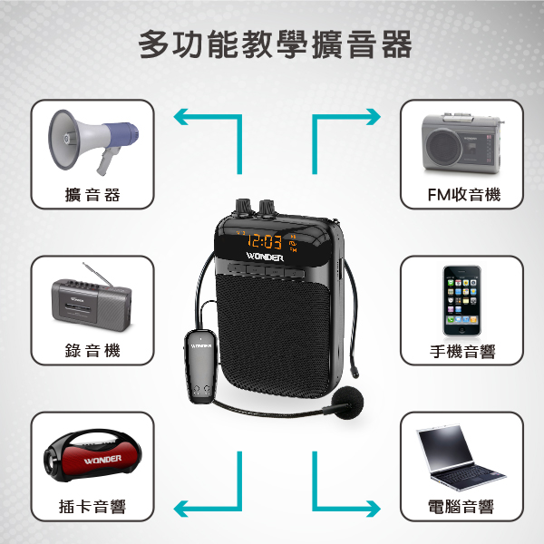 WONDER旺德 充電式無線教學擴音器 WS-P015 商品特色: ◆無線麥克風,使用沒束縛,擴音聲音清晰嘹亮 ◆機身輕巧,電力十足可連續使用8小時 ◆可插TF卡、USB直接播放MP3音樂,使用更方便 ◆AUX功能、錄音功能、收音機功能應有盡有 ◆電池電量顯示功能 ◆附腰掛繩,使用更全面